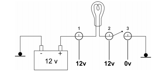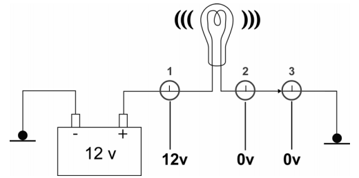 電流が流れていないときには電位差が発生しないので、バルブのアース側(2番)の電圧は12Vになります。