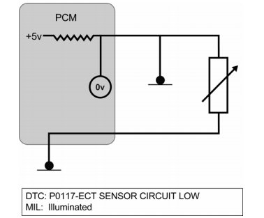 PCMは、「DTC P0117-ECT SENSOR CIRCUIT LOW」を保存し、MILランプを点灯させます。