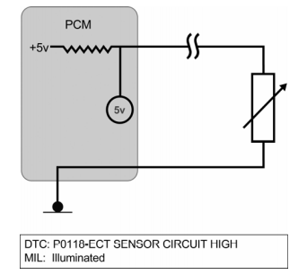 PCMは、「DTC P0118-ECT SENSOR CIRCUIT HIGH」を保存し、MILランプを点灯させます。