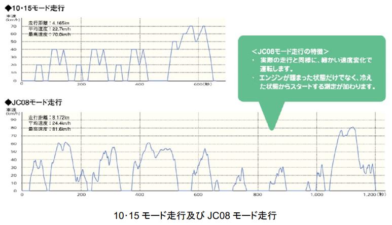 モード走行(所定の車速パターンに沿って走行)したときに排出されるCO?排出量から求めた燃料消費量と走行距離から、燃料1Lあたりの走行距離を算出してモード燃費(燃費)を評価します。