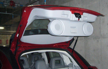 2個ある【2.5インチのツイータスピーカー】がインストルメントパネルの中に配置され、加えて2つの【3.5インチ中音域ツイータスピーカー】は、【フリップダウンリフトゲート】に装着された【スピーカーハウジング】の中に配置されています。